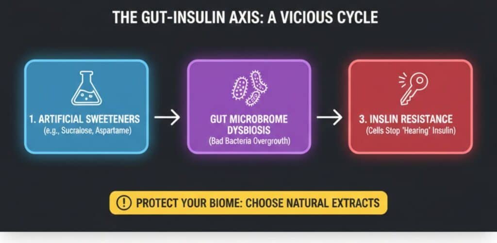 Mainstream advice often recommends Aspartame and Sucralose simply because they are calorie-free. However, modern research identifies the Gut-Insulin Axis as a critical factor; these synthetic chemicals can trigger Gut Dysbiosis, an imbalance in healthy bacteria that directly drives insulin resistance. For superior metabolic flexibility and long-term A1C control, prioritize microbiome-friendly options like Allulose and Monk Fruit.